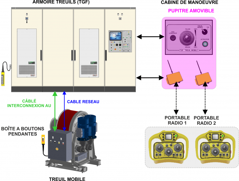 Le système de Contrôle-Commande du treuil mobile est composé d’un variateur, d’un module d’entrées / sorties déporté permettant l’échange d’informations avec l’automate du TGF (Armoire Treuils) et d’une interface opérateur (coffret électrique et boite à Boutons comme illustre ci-dessous).